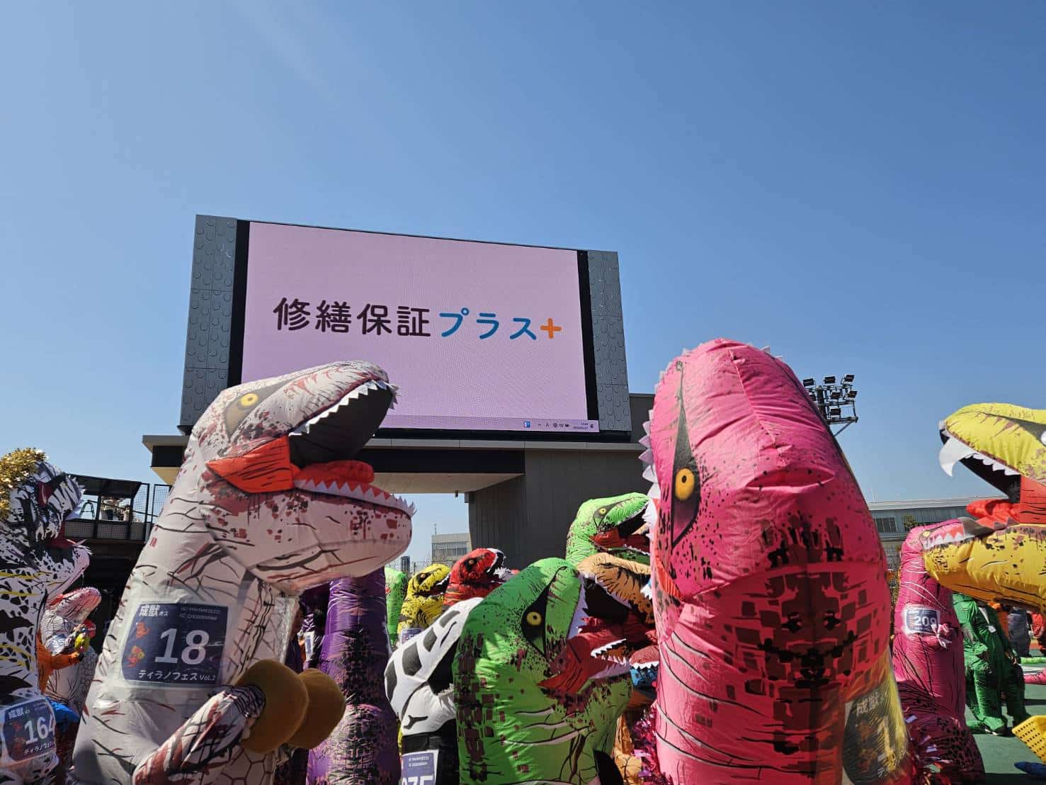 カラフルなティラノサウルスたちの背景に「修繕保証プラス+」の文字。 一見すると不思議な組み合わせですが、「大切な家族の笑顔を守りたい」「地域のイベントを盛り上げたい」という私たちの想いを、多くのご家族に知っていただく貴重な機会となりました。